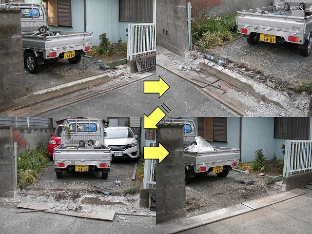 コンクリ基礎の斫り 車庫入り口のコンクリートを斫り撤去いたしました。 高さ20cm程の段差解消が目的で、奥行きは45cm有り、手前15cm程は基礎のコンクリートでした。 ブロック塀以外に、土間や基礎部分の斫りもご相談ください。